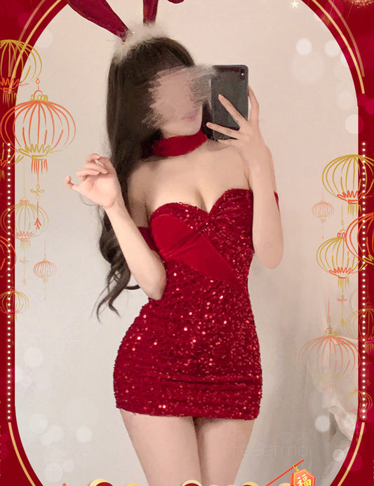 新年赤いうさぎセット バニーガール コスプレ ふわふわしっぽ ランジェリー 過激