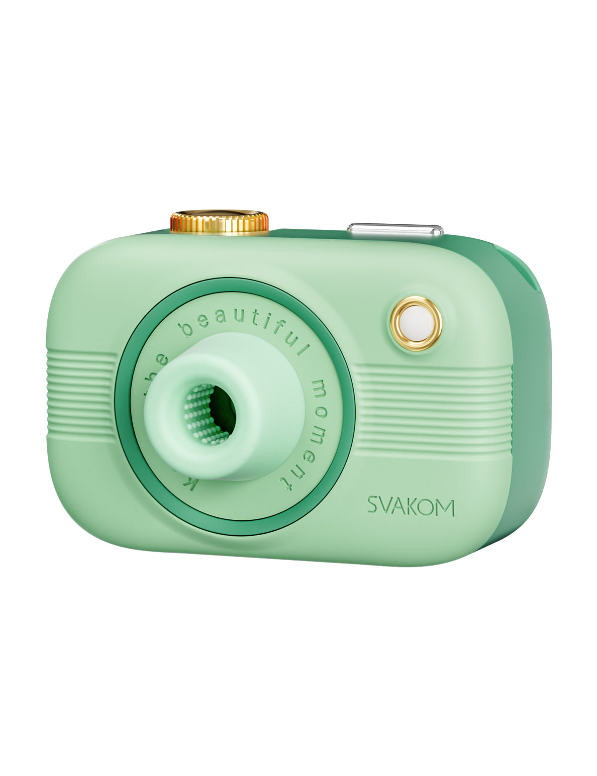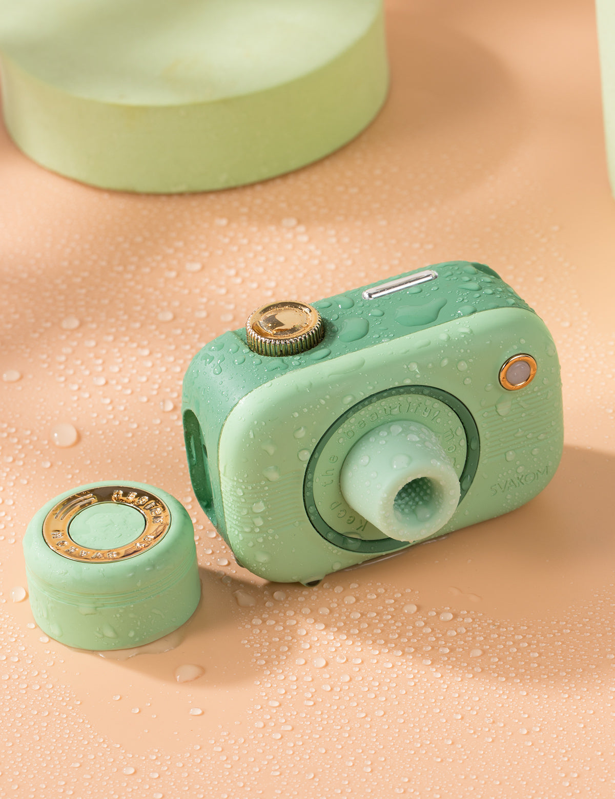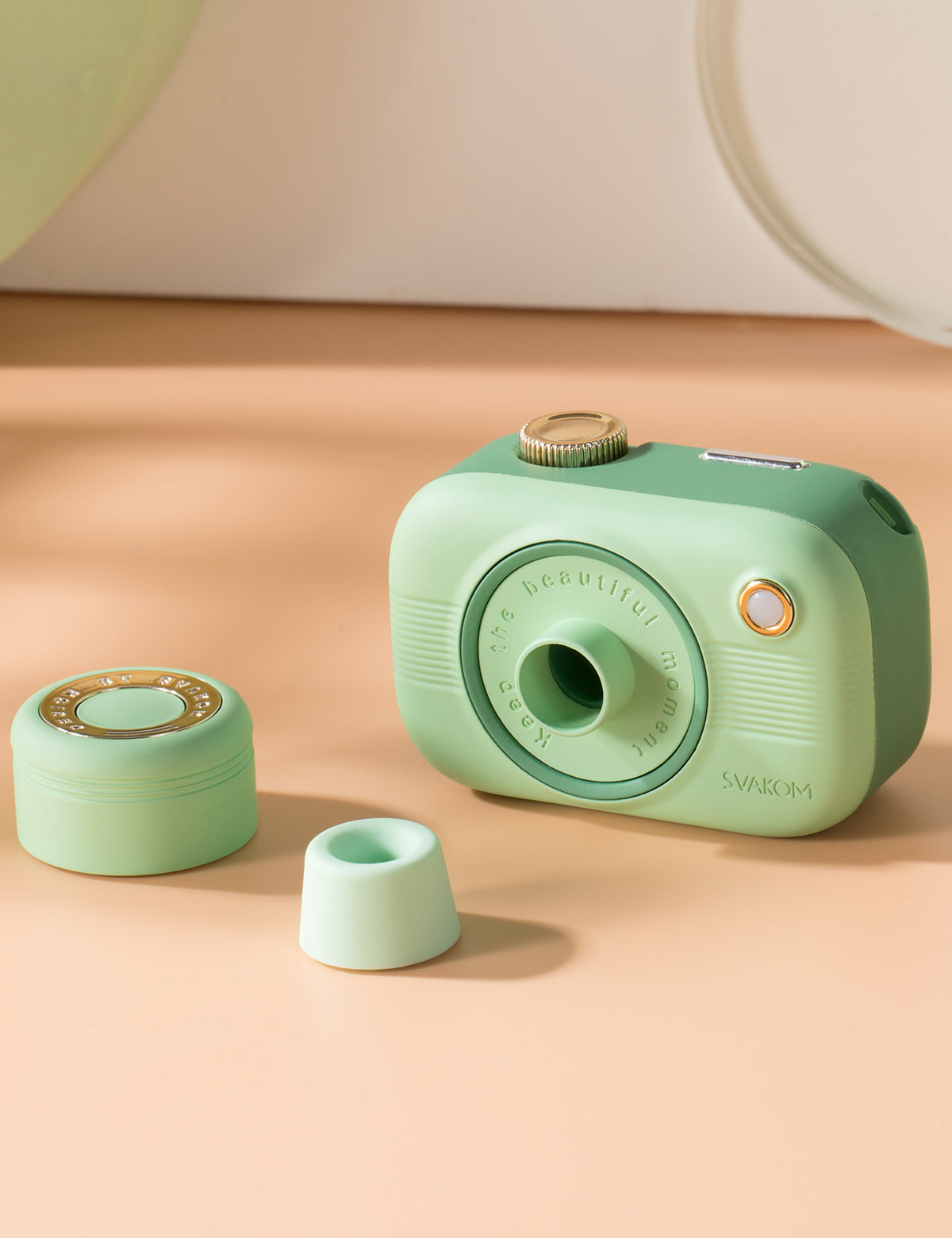 柔らかい印象のカメラとレンズキャップのデザイン。
